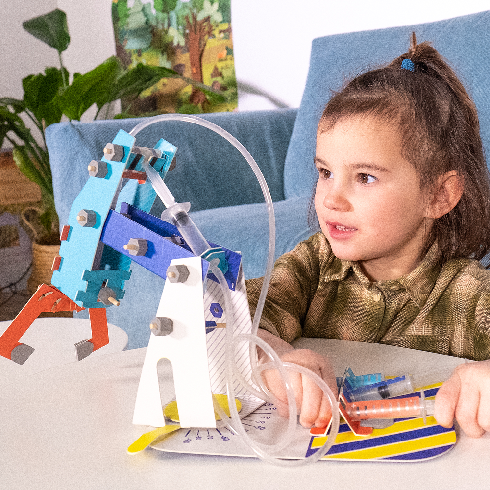 Construis ton bras robotique qui fonctionne grâce à un système hydraulique et joue en le faisant bouger dans 3 directions !